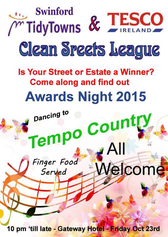 Swinford Tidy Towns 2015 Swinford Clean Street League Awards night will take place on Friday the 23rd of October at 10 pm in the Gateway Hotel Swinford. The Swinford Clean Street League which is now in its 4th year, is once again sponsored by Tesco Swinford.