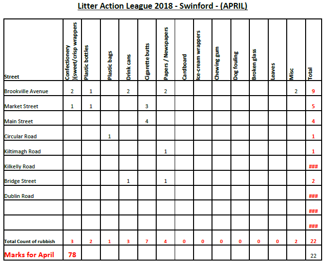Love where you live logoThe 2018 Mayo litter action league April results for Swinford have now been published. The Mayo Litter Action league competition runs from April to September. Judging in Swinford took place sometime between Monday the 9th of April and Monday the 30th of April. Each town and village in the competition is awarded €1,000 to begin with. Each item of litter seen on the day of judging costs €1, which is then deducted from your starting fund. The more items of litter found, the higher the cost, and the more we loose! We would ask all business’s to download the monthly results and display them on your premises, thank you.