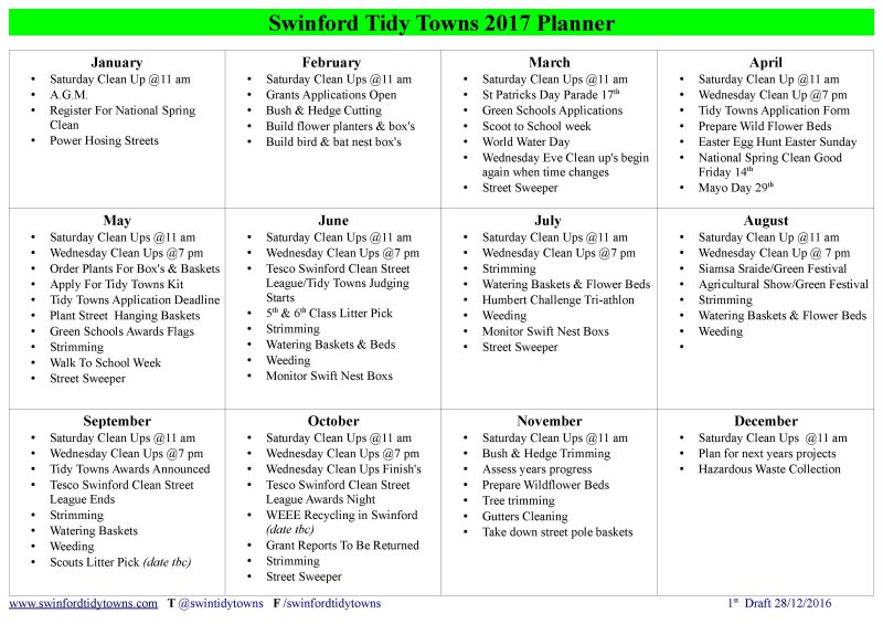 Wishing everyone a very happy new year 2017. We hope to start some new projects around Swinford in 2017. If you would like to help us out in any way, we would be most grateful. As you can see from our yearly planner below, there is lots to do, tidy towns is not just about litter picking!