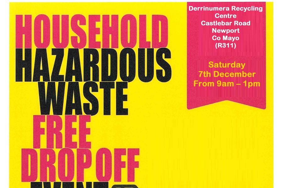 There will be another free Household Hazardous Waste Drop Off Event 7th December 2019, this time at Derrinumera Recycling Centre, Castlebar Road, Newport. The centre will be accepting household hazardous waste from 9am until 1pm, next Saturday the 7th of December.