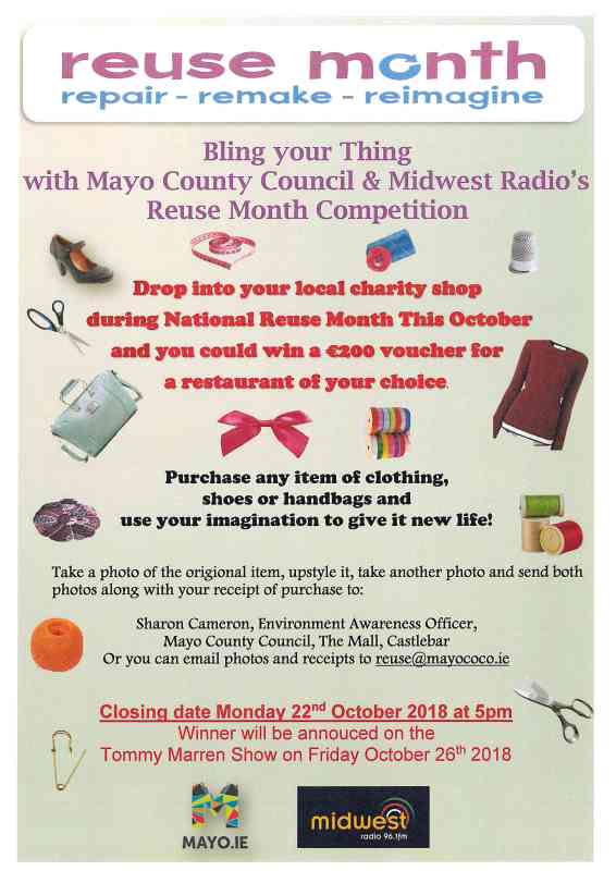 Drop into your local charity shop during national reuse month this October. Purchase any item of clothing, shoes or handbags and use your imagination to give it new life! We have 2 charity shops here in Swinford, Second Thoughts on lower main st and The Hospice Shop at the square. Take a photo of the original item before you do anything, upstyle it and then take another photo when complete. Send both photos along with the receipt for the original item and sent it on to;