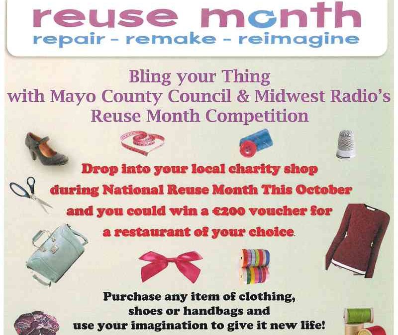 Drop into your local charity shop during national reuse month this October. Purchase any item of clothing, shoes or handbags and use your imagination to give it new life! We have 2 charity shops here in Swinford, Second Thoughts on lower main st and The Hospice Shop at the square. Take a photo of the original item before you do anything, upstyle it and then take another photo when complete. Send both photos along with the receipt for the original item and sent it on to;