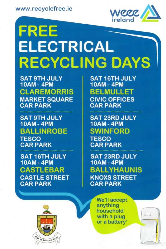 There will also be other WEEE Electrical collection days in other locations around Mayo during the month of July as follows;